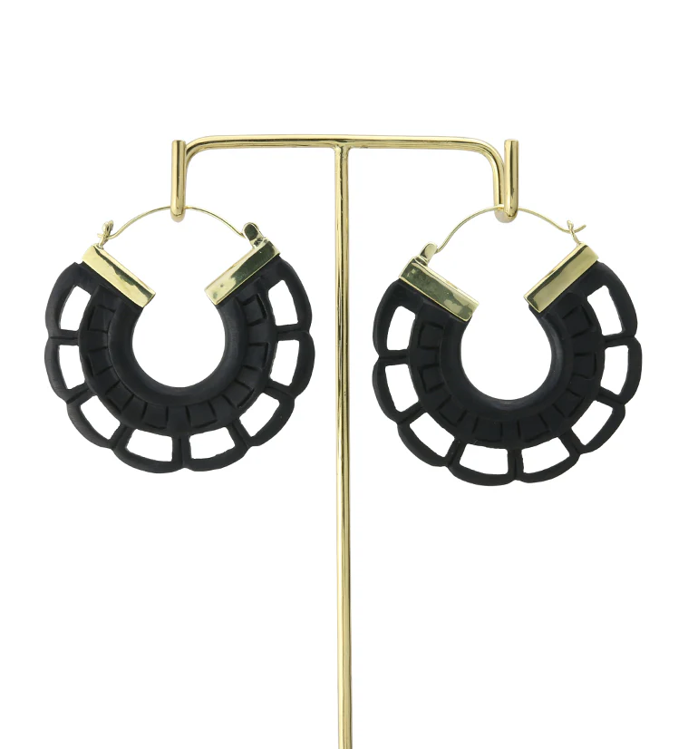 Made from sono wood and brass wire, these hangers have a fun design and half-tire shape. They are a size 18G and have a height of 60mm and width of 55mm. Add these handcrafted hangers to your ear weight/hanger collection!