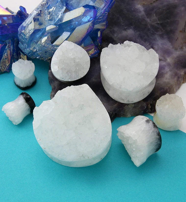 Raw White Quartz Druzy Stone Teardrop Plugs